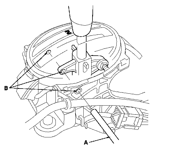 8. Insert a 6.0 mm (0.24 in.) pin (A) through the positioning holes (B) on the shift lever bracket base and into the positioning hole on the shift lever. Use only the 6.0 mm (0.24 in.) pin.