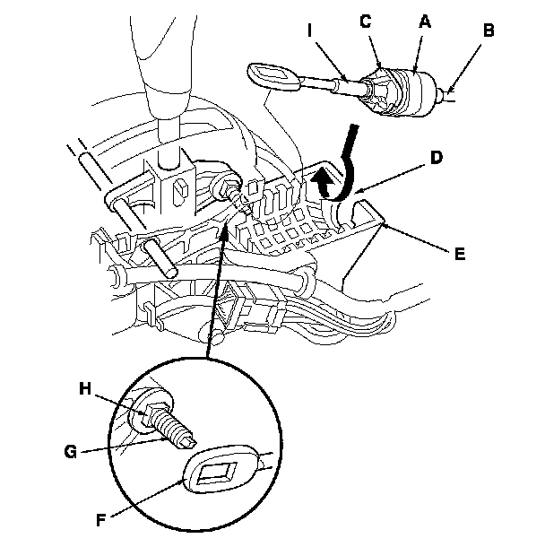10. Rotate the socket holder (A) on the shift cable (B) to place the corner (C) on the holder opposite the opening (D) in the shift lever bracket base (E). Align the holder with the opening in the bracket, then slide the holder into the bracket. Install the shift cable end (F) over the mounting stud (G) by aligning its square hole with the square fitting (H) at the bottom of the stud. Rotate the holder a quarter turn until the holder stops to secure the shift cable. Do not install the shift cable by twisting the shift cable guide (I).