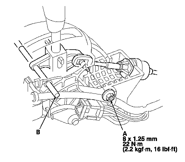 14. Remove the 6.0 mm (0.24 in.) pin (B) that was installed to hold the shift lever.
