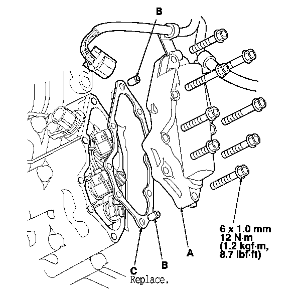 11. Remove the shift solenoid valve cover (A), the dowel pins (B), and the gasket (C).