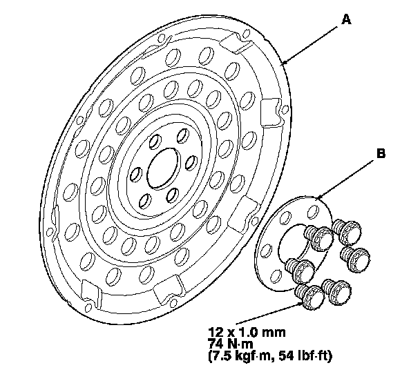 2. Remove the drive plate (A) and the washer (B) from the engine crankshaft.