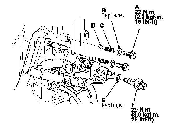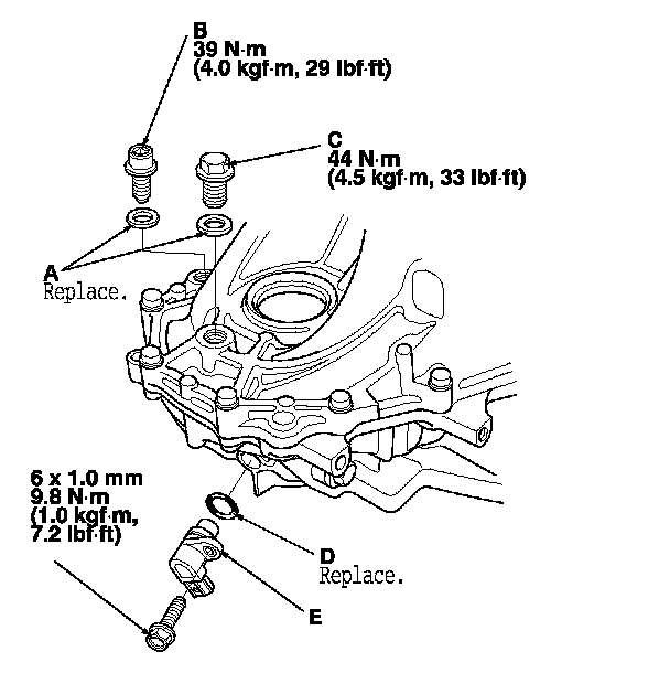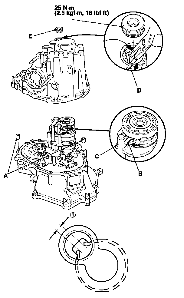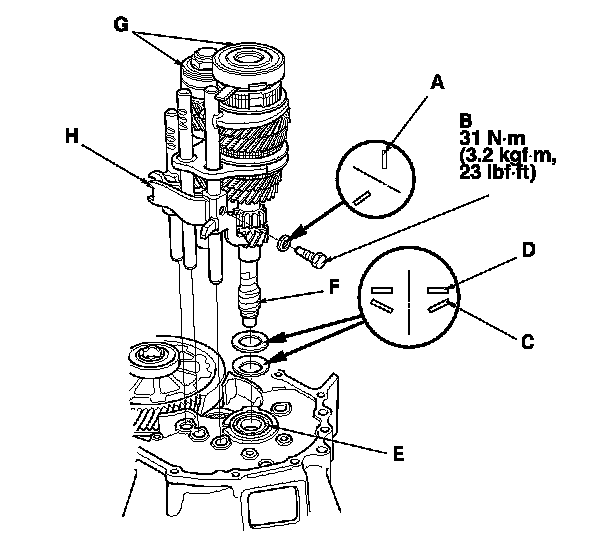 15. Apply liquid gasket (P/N 08717-0004, 08718-0001, 08718-0003, 08718-0009, or 08718-0012) to the threads of the 32 mm sealing screw (E), and install it on the transmission housing.