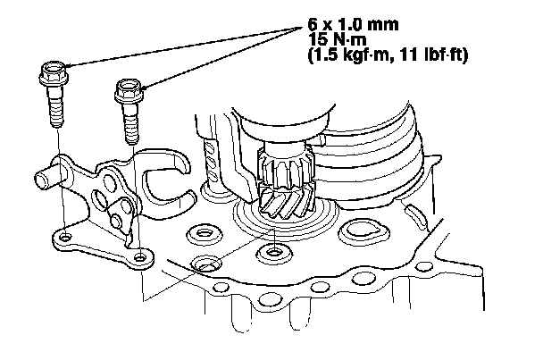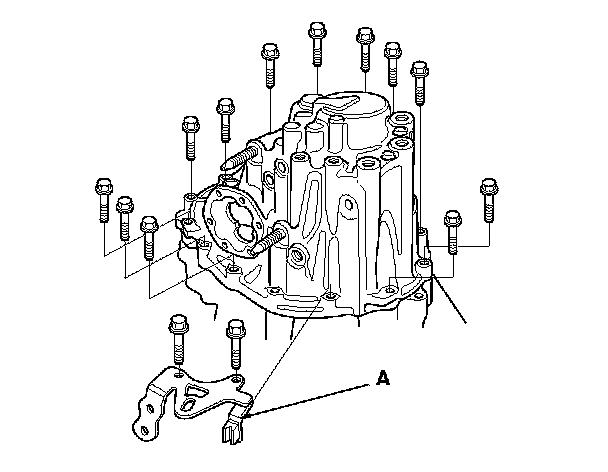 16. Install the transmission hanger (A) and the 8 mm flange bolts finger-tight.
