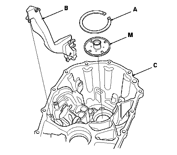 8. Select the proper size 72 mm shim (A) according to the measurements made during the Mainshaft Thrust Clearance Adjustment. M/T Mainshaft Thrust Clearance Adjustment Install the oil gutter plate (B), oil guide plate M, and the 72 mm shim into the transmission housing (C).