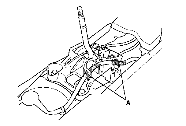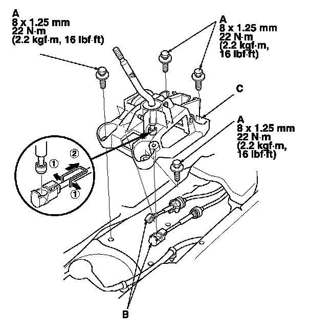 4. Remove the four bolts (A). Disconnect the shift cables (B) from the shift lever, then remove the shift lever housing (C).