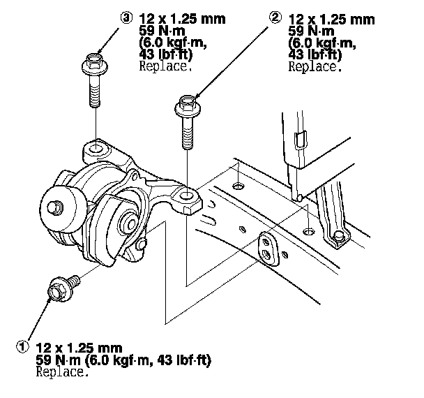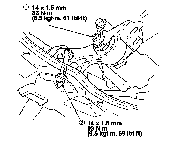 16. Tighten the torque rod mounting bolt and nut in the numbered sequence shown.