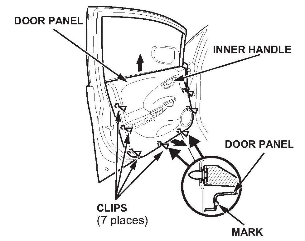 6. Starting at the bottom edge of the door panel, release the clips that are just above the marks on the edge of the door panel with a commercially available trim pad remover.