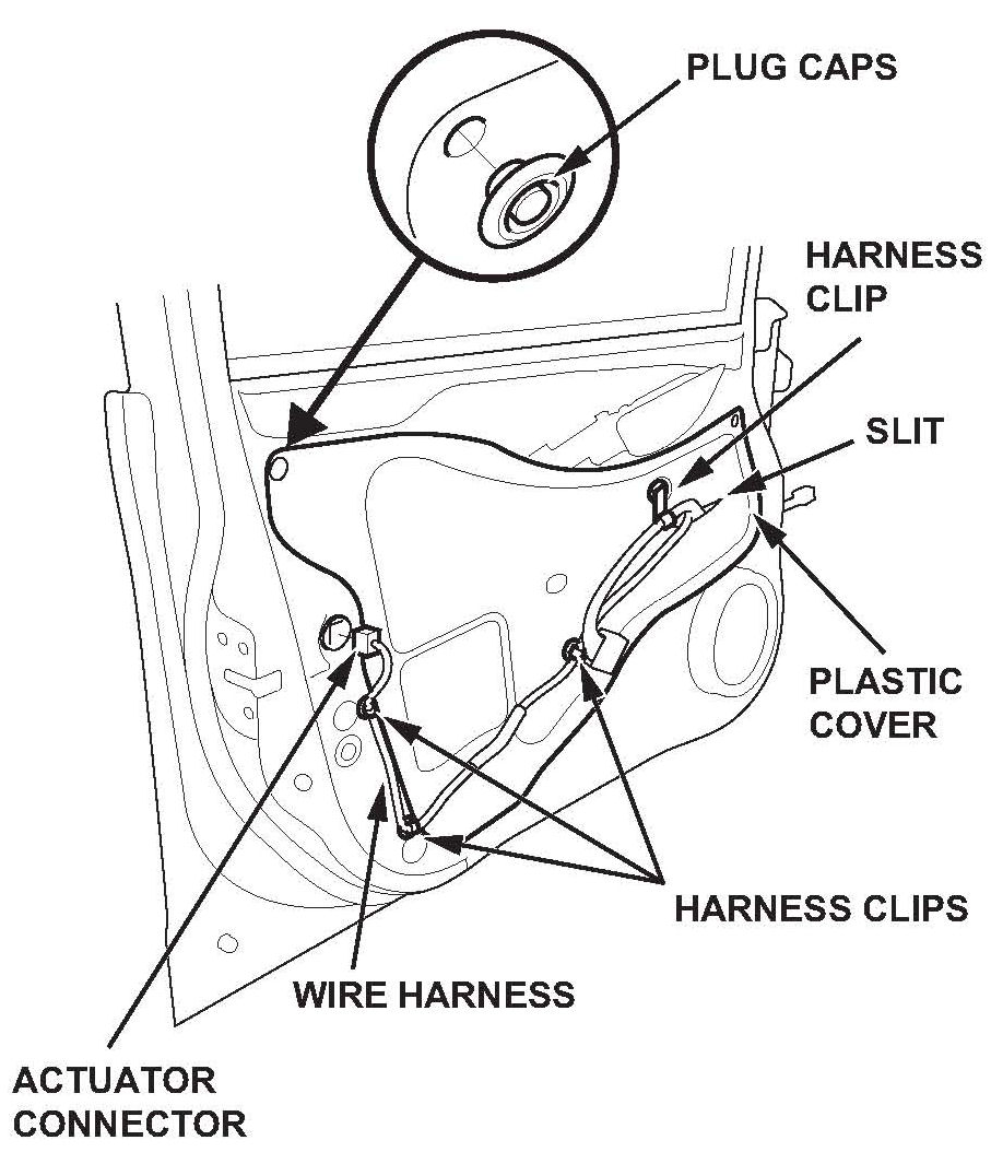 10. If equipped, disconnect the power door lock actuator connector, and detach the harness clips.