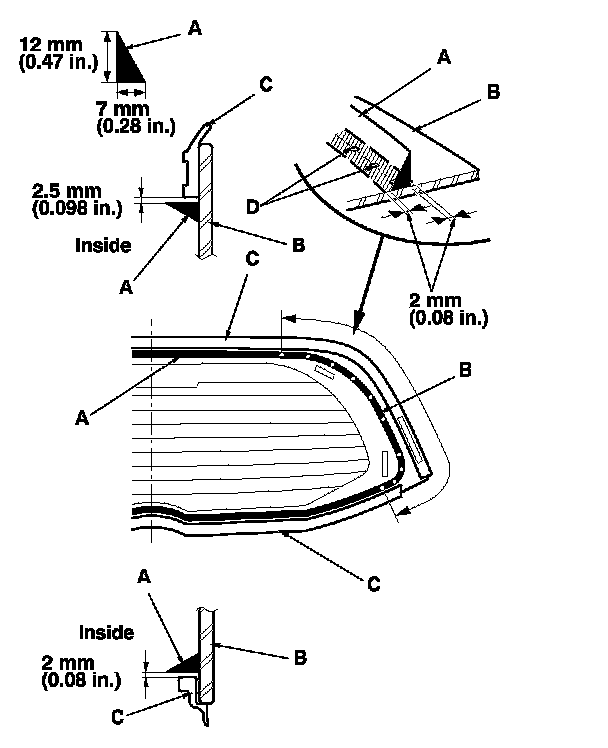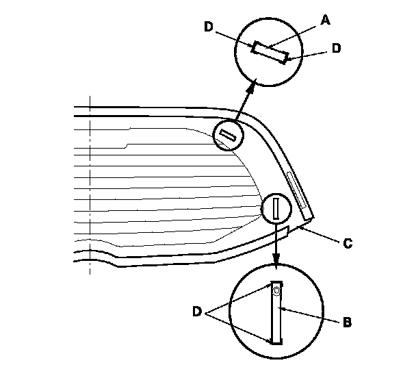 20. Put the cartridge in a caulking gun, and run a continuous bead of adhesive (A) around the edge of the rear window (B) and along the rubber dams (C) as shown. Apply the adhesive to both side portions of the rear window, using the printed dots (D) on the rear window as a guide. Apply the adhesive within 30 minutes after applying the glass primer. Make a slightly thicker bead at each corner.