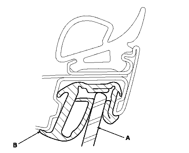 6. Raise the glass fully, and check for gaps. Also check that the glass (A) contacts the glass run channel (B) evenly.