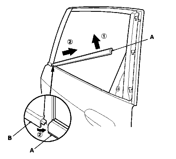 2. While lifting the rear of the door glass outer weatherstrip (A), slide the weatherstrip rearward to release the front edge of the weatherstrip from the door sash outer trim (B), then remove the weatherstrip.