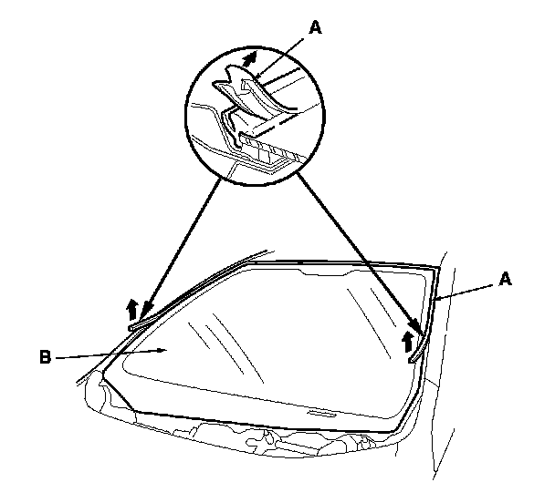 2. Remove the molding (A) from the edge of the windshield (B). If necessary, cut the molding with a utility knife.