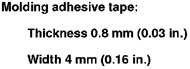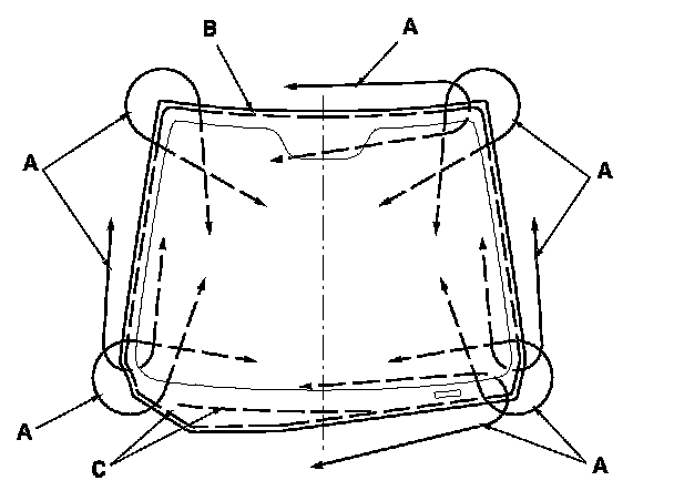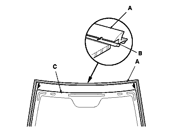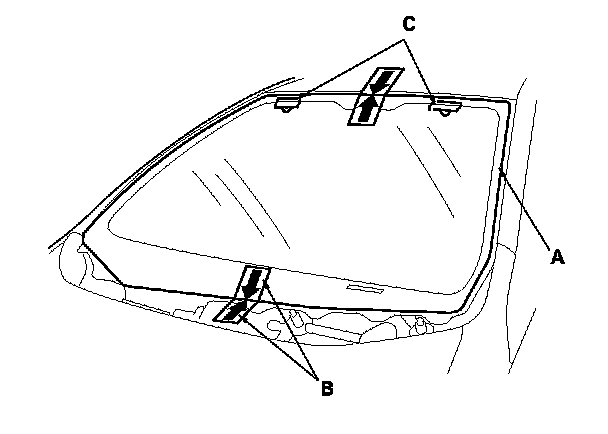 13. Keep water, dust, and abrasive materials away from the primed surfaces. Attach the molding (A) with adhesive tape (B) to the edge of the windshield (C):