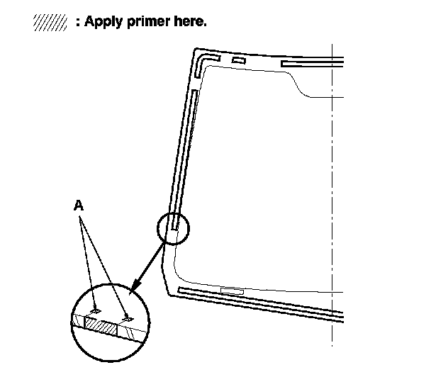 12. Apply a light coat of glass primer to the windshield edges where you will install the new molding. Use the alignment marks (A) as a guide. After the primer dries, lightly wipe it off with gauze or cheesecloth.