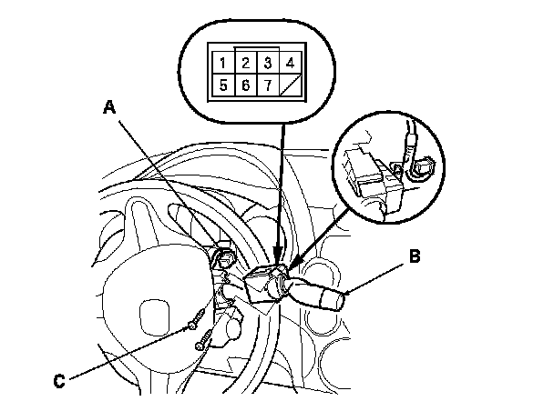 3. Turn the steering wheel to access the wiper/washer switch screws (C).