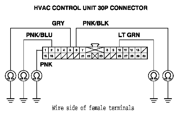 4. Check for continuity between body ground and HVAC control unit 30P connector terminals No. 1, 2, 5, 6, and 10 individually.