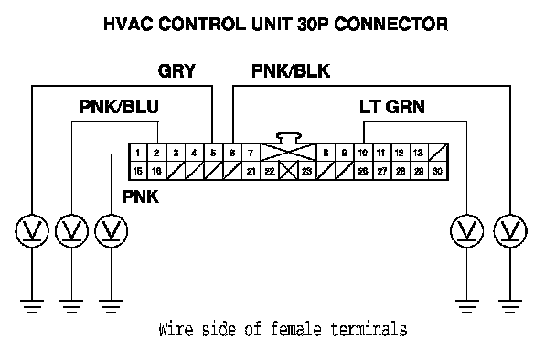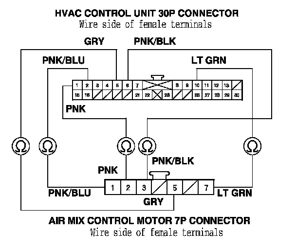 6. Turn the ignition switch to LOCK (0), and check for continuity between the following terminals of the HVAC control unit 30P connector and the air mix control motor 7P connector.