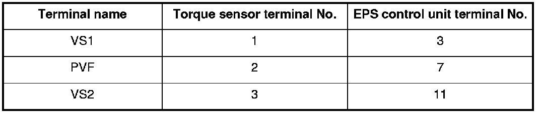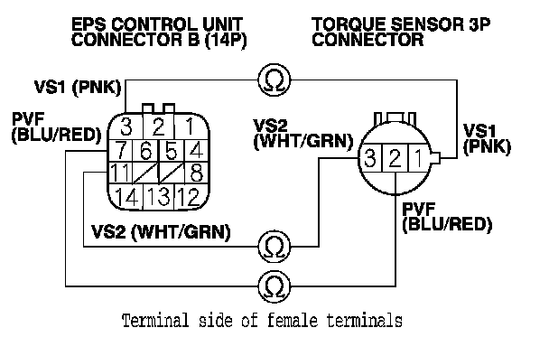 12. Check for continuity between the appropriate EPS control unit connector B (14P) and torque sensor 3P connector terminals (see table).