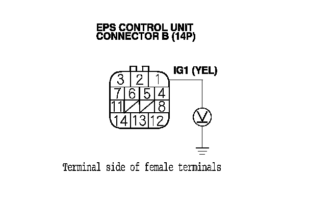 15. Measure the voltage between EPS control unit connector B (14P) terminal No. 1 and body ground.