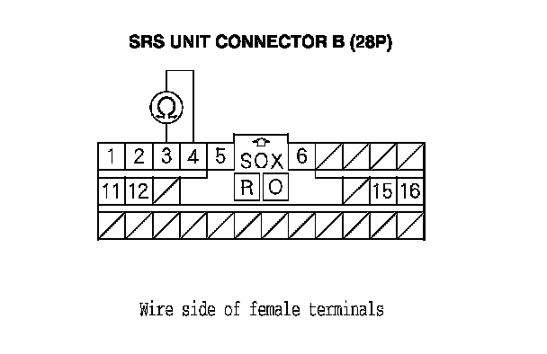 12. Measure the resistance between SRS unit connector B (28P) terminals No. 3 and No. 4. There should be 2.0-3.0 Ohms.