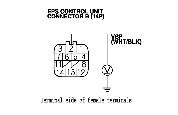6. Block the right rear wheel, and slowly rotate the left rear wheel and measure the voltage between EPS control unit connector B (14P) terminal No. 2 and body ground.