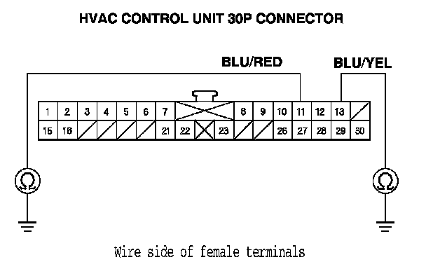 13. Check for continuity between HVAC control unit 30P connector terminals No. 11 and No. 13 and body ground individually.