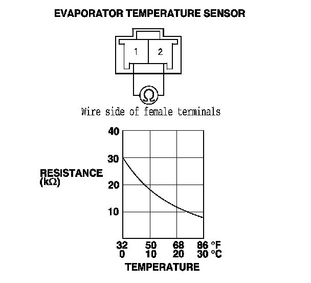 2. Measure the resistance between evaporator temperature sensor terminals No. 1 and No. 2.