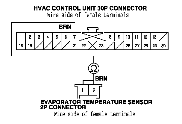 6. Check for continuity between HVAC control unit 30P connector terminal No. 10 and evaporator temperature sensor 2P connector terminal No. 1.