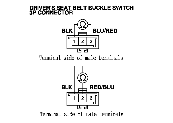 Measure the resistance between driver's seat belt buckle switch 3P connector terminals No. 1 and No. 2. There should be less than 1.0 Ohms.
