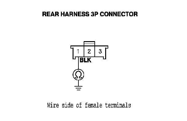 8. Measure the resistance between rear harness 3P connector terminal No. 1 and body ground. There should be less than 1.0 Ohms.