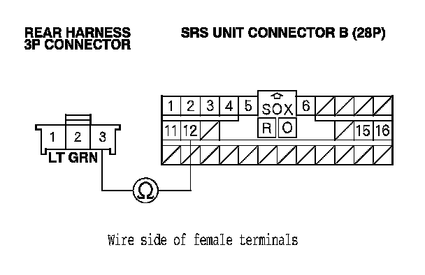 12. Measure the resistance between SRS unit connector B (28P) terminal No. 12 and rear harness 3P connector terminal No. 3. There should be less than 1.0 Ohms.
