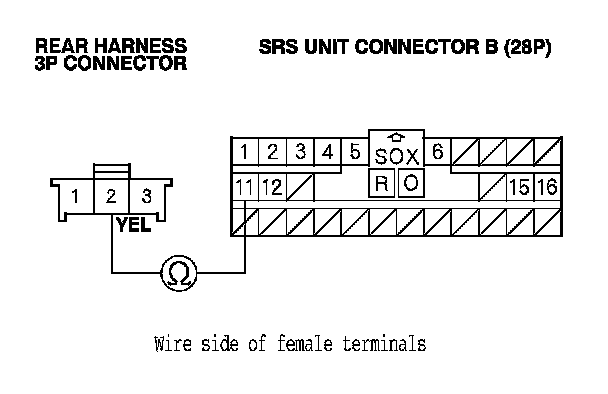 13. Measure the resistance between SRS unit connector B (28P) terminal No. 11 and rear harness 3P connector terminal No. 2. There should be less than 1.0 Ohms.