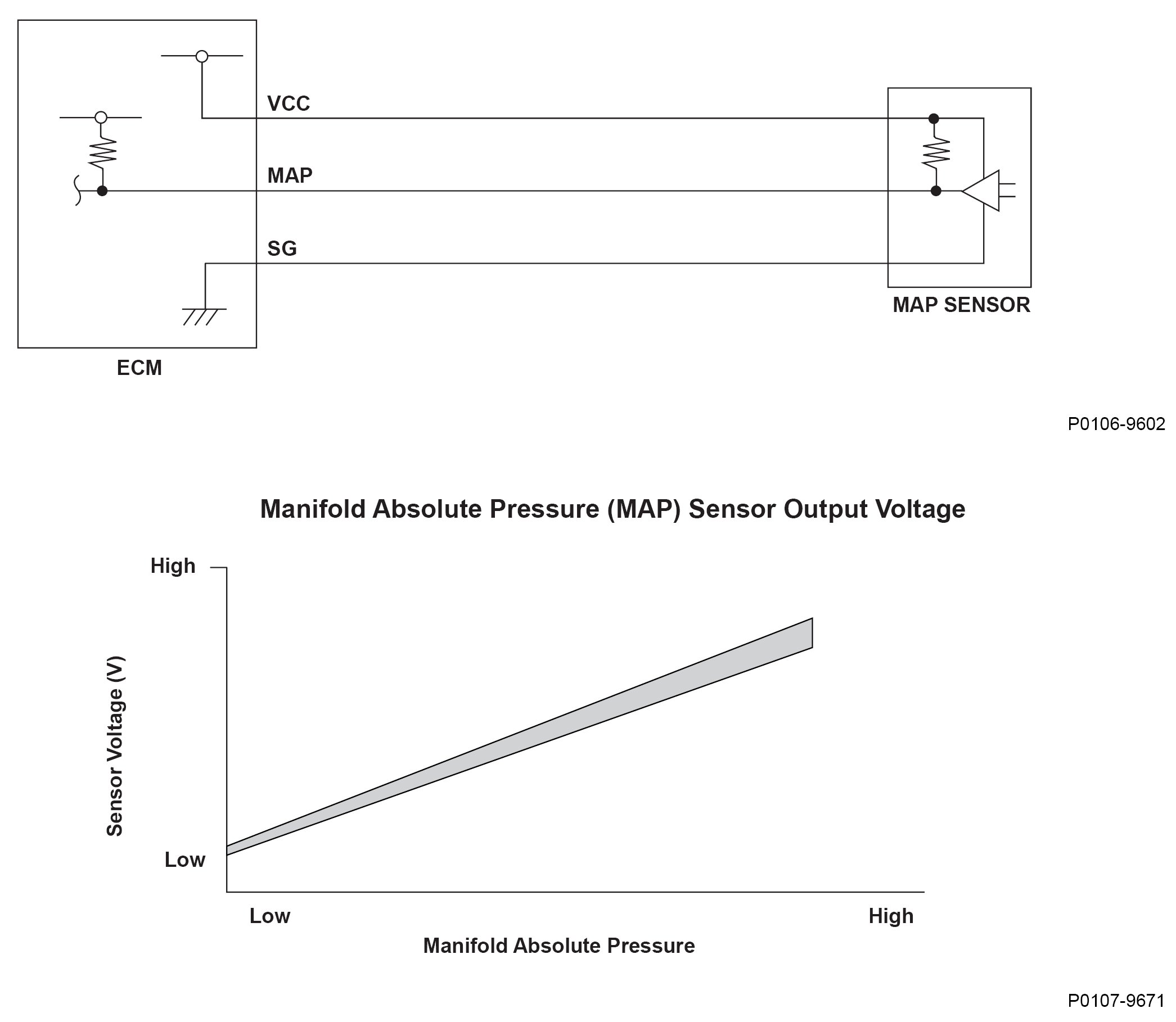 The manifold absolute pressure (MAP) sensor senses manifold absolute pressure (vacuum) and converts it into electrical signals. The MAP sensor outputs low signal voltage at high vacuum (throttle valve closed) and high signal voltage at low vacuum (throttle valve wide open). If a signal voltage from the MAP sensor is a set value or more the engine control module (ECM) detects a malfunction and a DTC is stored.