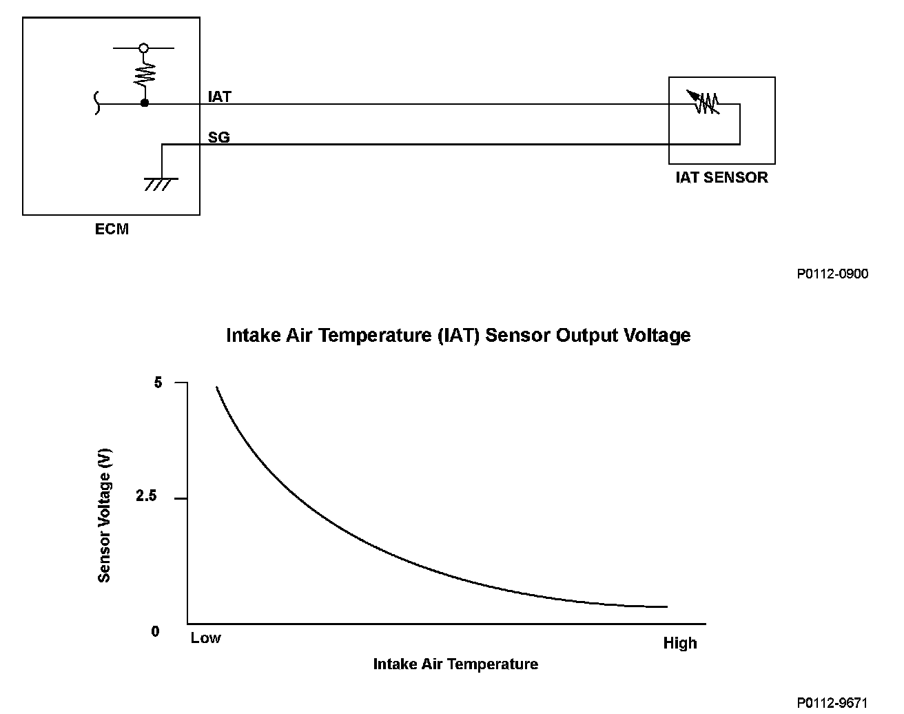 The intake air temperature (IAT) sensor is a thermistor that detects intake air temperature and it is used for A/F feedback control to compensate for the atmospheric density fluctuations that accompany changes in intake air temperature. The IAT sensor resistance varies depending on temperature. The output voltage and the sensor resistance increase as the intake air temperature decreases. Conversely the output voltage and the sensor resistance decrease as the intake air temperature increases. If the IAT sensor output voltage is excessively low the engine control module (ECM) detects a malfunction and a DTC is stored.