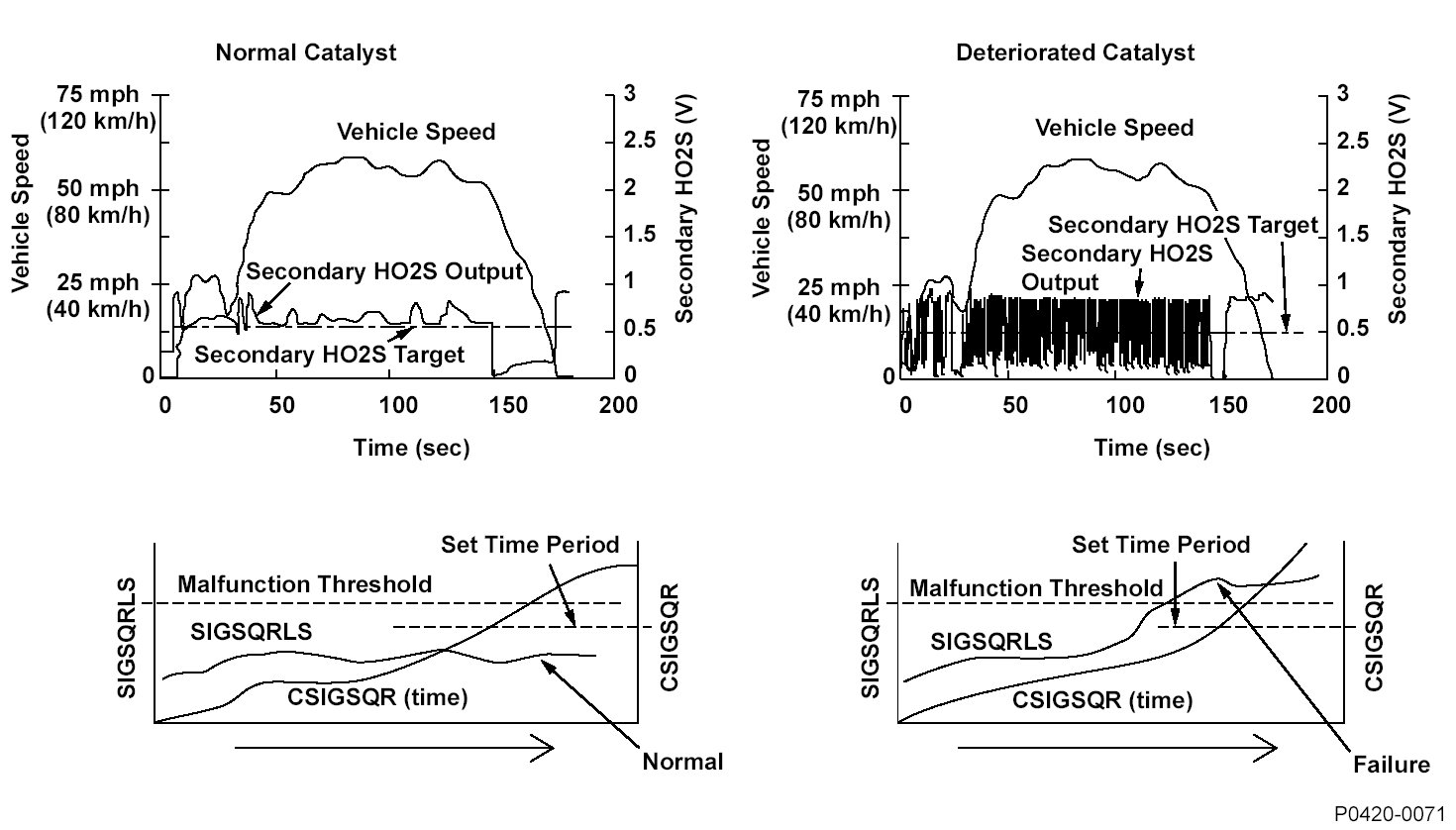 If the TWC deteriorates, the air/fuel ratio downstream of the TWC (the secondary HO2S output) often differs from the target secondary HO2S output, and the status is represented by the parameter (SIGSQRLS).