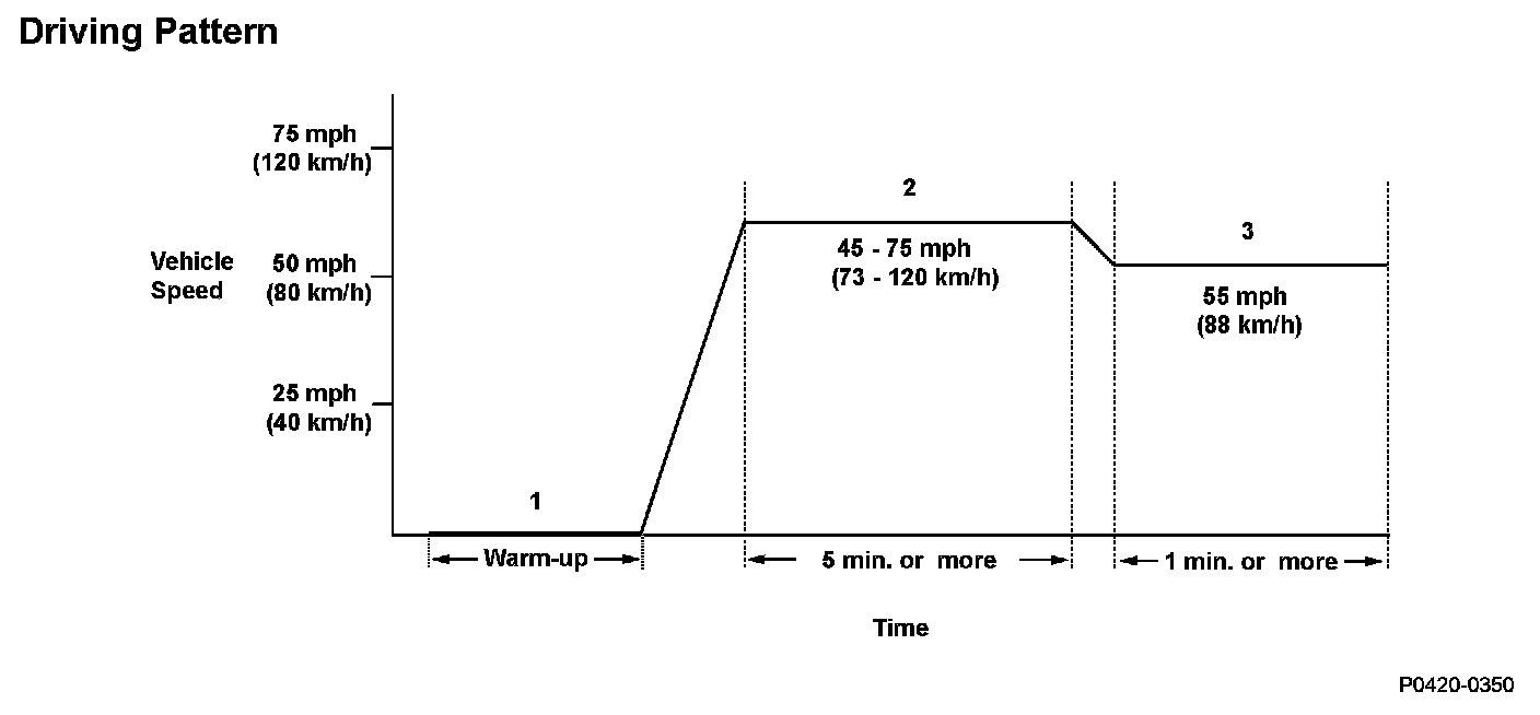 2. Drive the vehicle at a speed between 45 - 75 mph (73 - 120 km/h) for at least 5 minutes, to warm up the TWC.