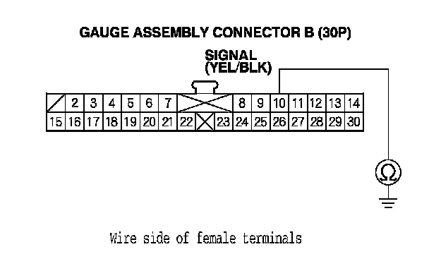 11. Check for continuity between gauge assembly connector B (30P) terminal No. 2 and body ground.