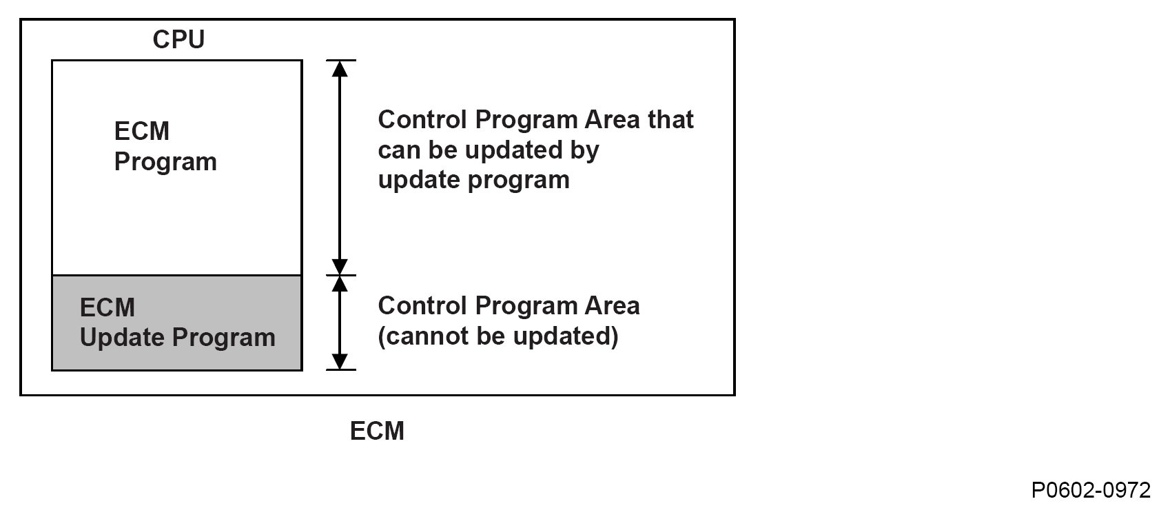 The engine control module (ECM) is equipped with an update program to update its control program. The programs in the CPU of the ECM are classified as a ECM program (update-capable program) and a program for the update function (non-updatable program). The program update only updates the ECM program. When the ECM power is turned off during an update, the power for the update function is lost, and the update process stops. When the program update is stopped before it is completed, the ECM stores a DTC that indicates the update is not finished.