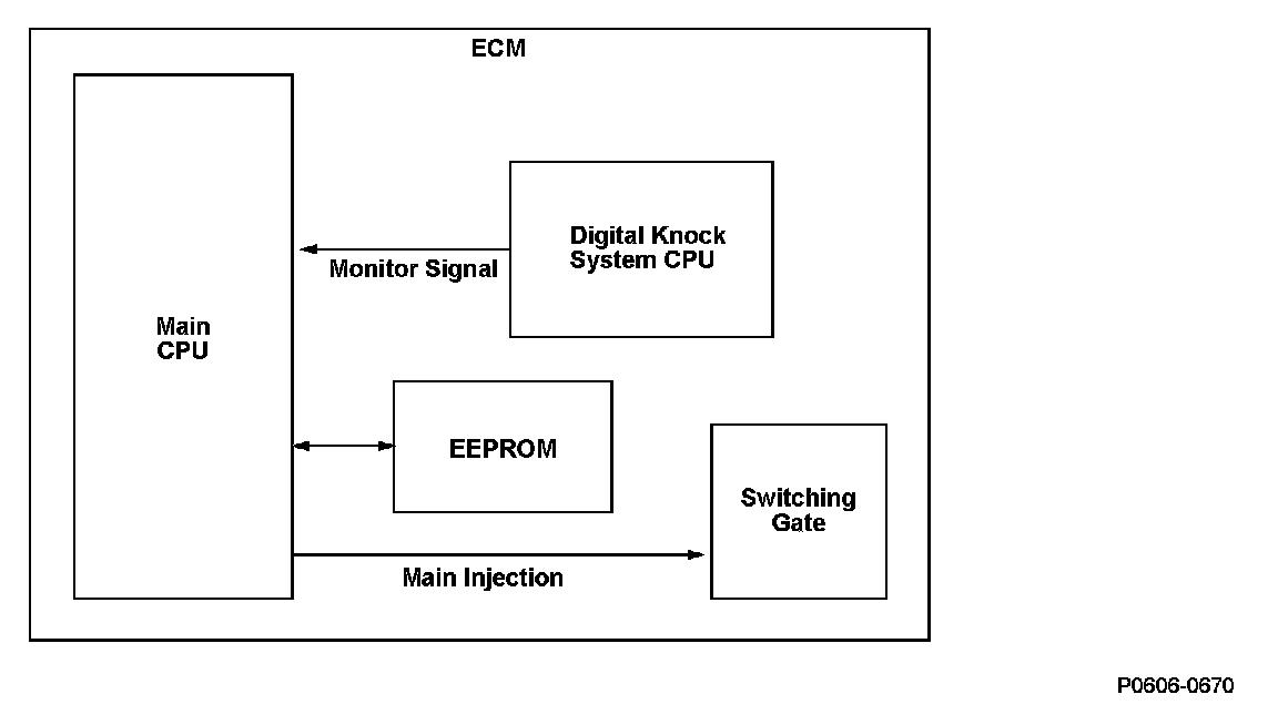 If something is wrong in the engine control module (ECM), and the monitor signal from the digital knock system CPU is not received for a set time, or a signal communication error remains for a set time, the ECM detects a malfunction and a DTC is stored.