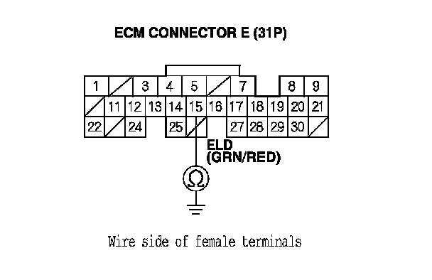 10. Check for continuity between ECM connector terminal E15 and body ground.
