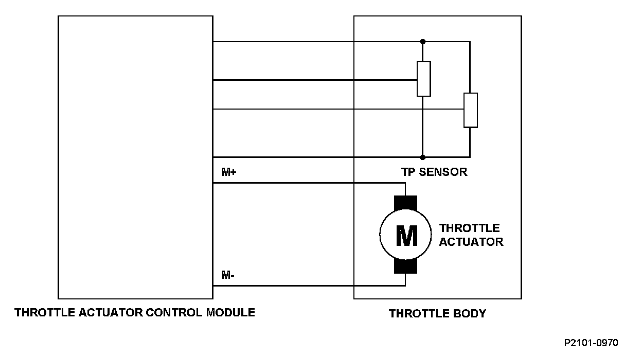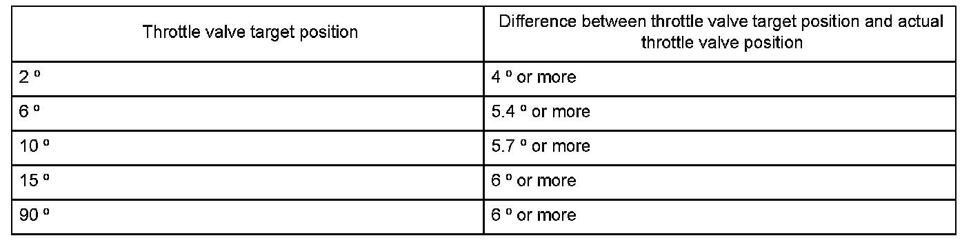 The electronic throttle control system (ETCS) controls the throttle valve opening. The system includes the throttle actuator, the throttle valve, throttle position (TP) sensors A and B, the throttle actuator control module, the throttle actuator control module relay, the accelerator pedal position (APP) sensor, and the engine control module (ECM). When the accelerator pedal is pressed, the APP sensor detects the accelerator opening value. The accelerator pedal opening value is converted to a signal in the APP sensor and transmitted to the ECM to compute the target position. The target position signal is then transmitted to the throttle actuator control module. The throttle actuator control module then operates the throttle actuator to move the throttle valve to the target position. The actual throttle valve position is determined by TP sensor A (installed in the throttle body). The throttle actuator control module compares the throttle valve target opening angle and the actual throttle valve opening angle from TP sensor A, and when the difference exceeds the specification, the throttle actuator control module transmits the malfunction data to the ECM. When the ECM receives the malfunction data, it detects a malfunction of the throttle actuator system and a DTC is stored.