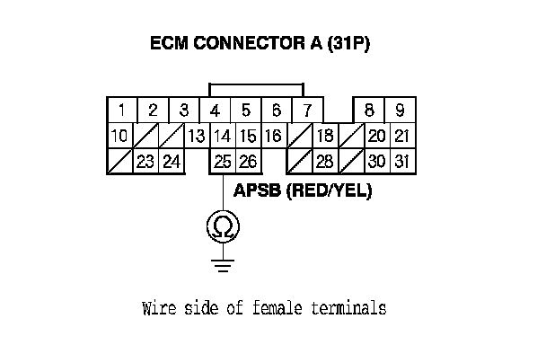 12. Check for continuity between ECM connector terminal A25 and body ground.