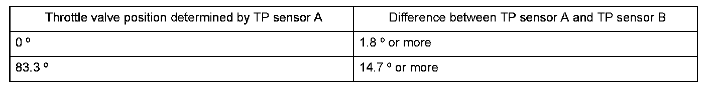 - The difference between the throttle valve positions that TP sensor A and TP sensor B determined exceeds the value shown in this table.