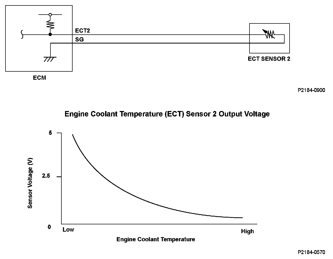 Engine coolant temperature (ECT) sensor 2 is a thermistor installed on the radiator. The engine control module (ECM) applies voltage (about 5 V) to the ECT2 signal circuit through a pull up resistor. As the engine coolant temperature cools, ECT sensor 2 resistance increases, and the ECM detects a high signal voltage. As the engine coolant warms, the sensor resistance decreases, and the ECM detects a low ECT2 signal voltage. If the ECT sensor 2 output voltage is more than a set value when the engine coolant temperature is low, the ECM detects a malfunction and a DTC is stored.