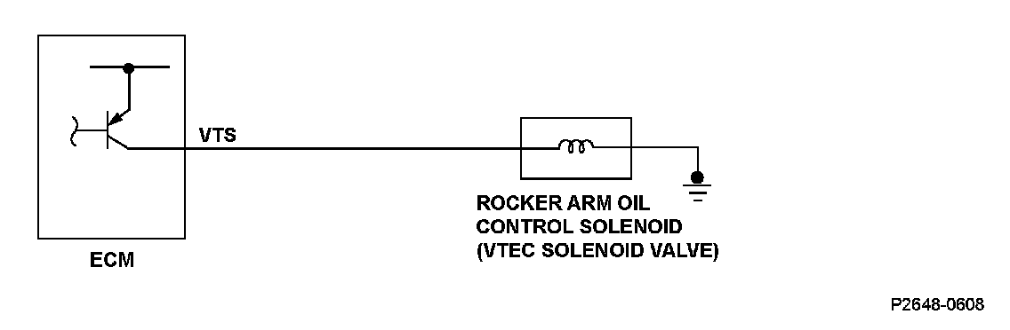 The VTEC system activates the rocker arm oil control solenoid (VTEC solenoid valve) by command from the engine control module (ECM), and it charges/discharges the hydraulic circuit of the VTEC mechanism that switches valve timing between low and high. If the return signal is OFF (low) when the ECM outputs the ON (high) signal to the rocker arm oil control solenoid (VTEC solenoid valve), the ECM detects a malfunction and a DTC is stored.