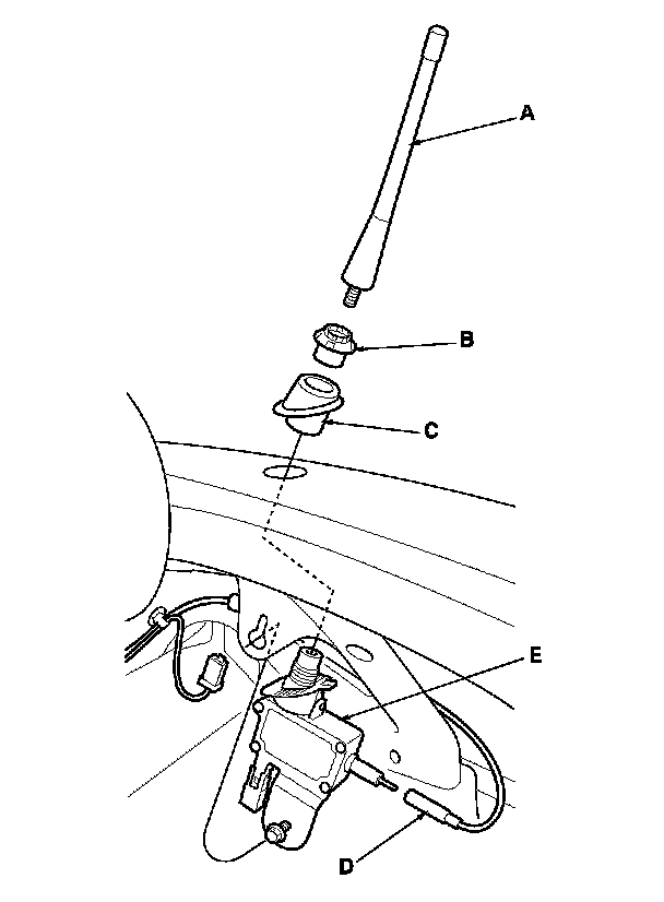 6. Disconnect the AM/FM antenna lead (D) from the AM/FM antenna amplifier (E).