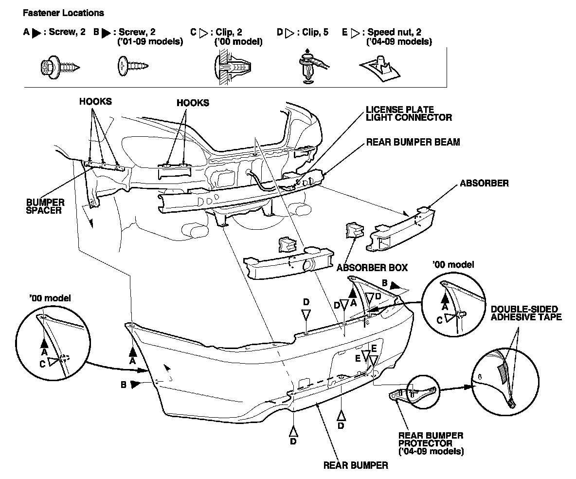 1. Remove the rear bumper as shown. For '04-09 models, to release the speed nuts, refer to front grille replacement. Service and Repair