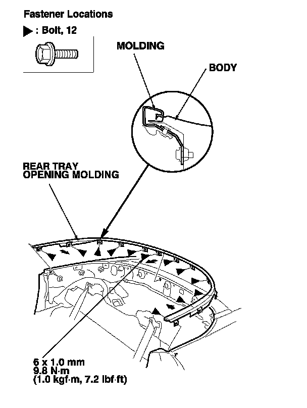 1. Remove these items, then remove the rear tray opening molding as shown: