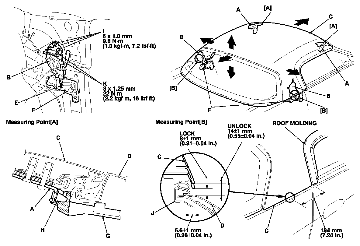 -3 To adjust the horizontal clearance between the side edges of the roof and the rear tray opening molding (J), loosen the holder plate mounting bolts (K), then move the roof to the right or left.
