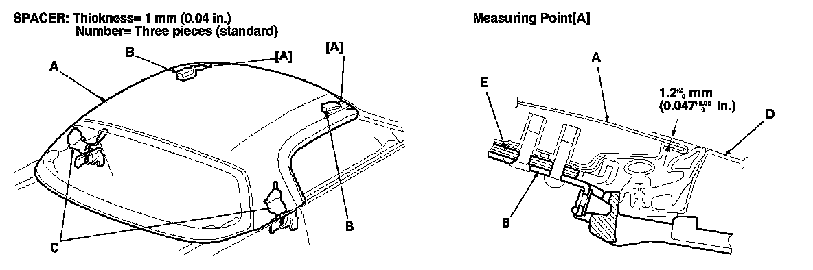 6. Lock the roof (A) securely with both lock handles (B) and both roof side locks (C). Check the level difference between the roof and body (D) at the measuring point [A]. If the difference is not within specification, remove the roof from the body, and adjust the difference by adding or removing spacers (E) between the lock handle and the roof.